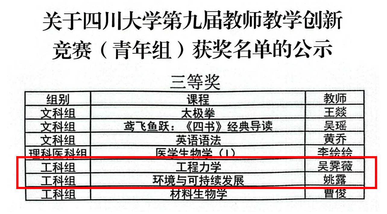 近日,以“推动教学创新、培养一流人才”为主题的四川大学第九届教师教学创新竞赛青年组比赛在望江校区圆满落幕。试玩平台 吴霁薇副研究员和姚露副研究员荣获“四川大学第九届青年教师教学创新竞赛(青年组)”三等奖。